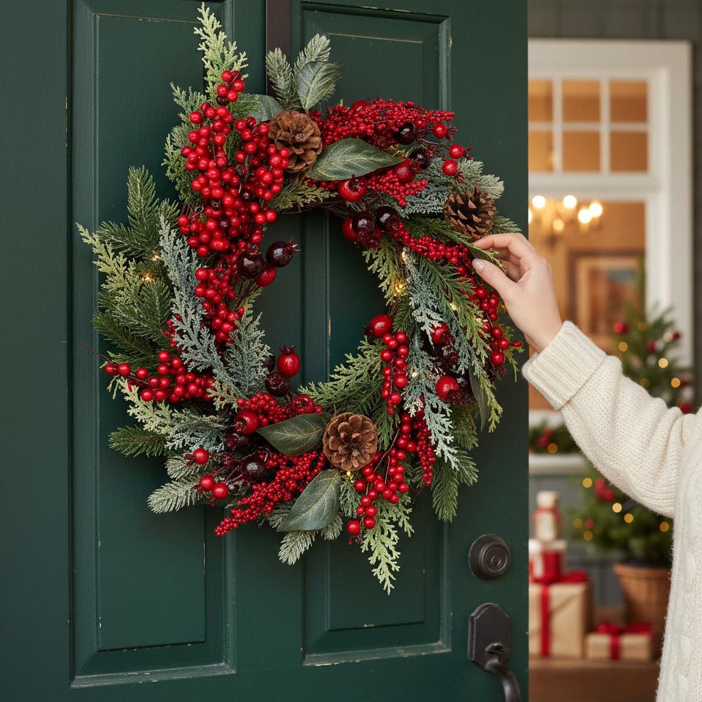 Descrizione: CORONA D.36 CM BACCHE E PINO BRINATO